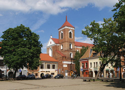 Construction of the Kaunas Cathedral took place in stages, starting in the 15th century and ending in the 20th. Its architecture includes both gothic and renaissance traits. From the outside, the rectangular three-nave Basilica is an impressive bare brick structure with a massive tower rising to a height of 41.9 meters (137 feet). The external structural design features large, simple shapes distributed asymmetrically, among which the white-plastered cornices and ledges stand out, as do the arch windows and buttresses. The Chapel of the Blessed Sacrament, built in the late 19th century in an extension of the southern nave, is like a tiny church in its own right, nestled up against the immense Cathedral.